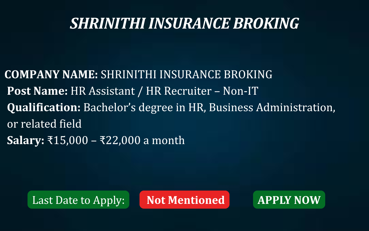 HR Assistant / HR Recruiter (Non-IT) – Shrinithi Insurance Broking (2025)