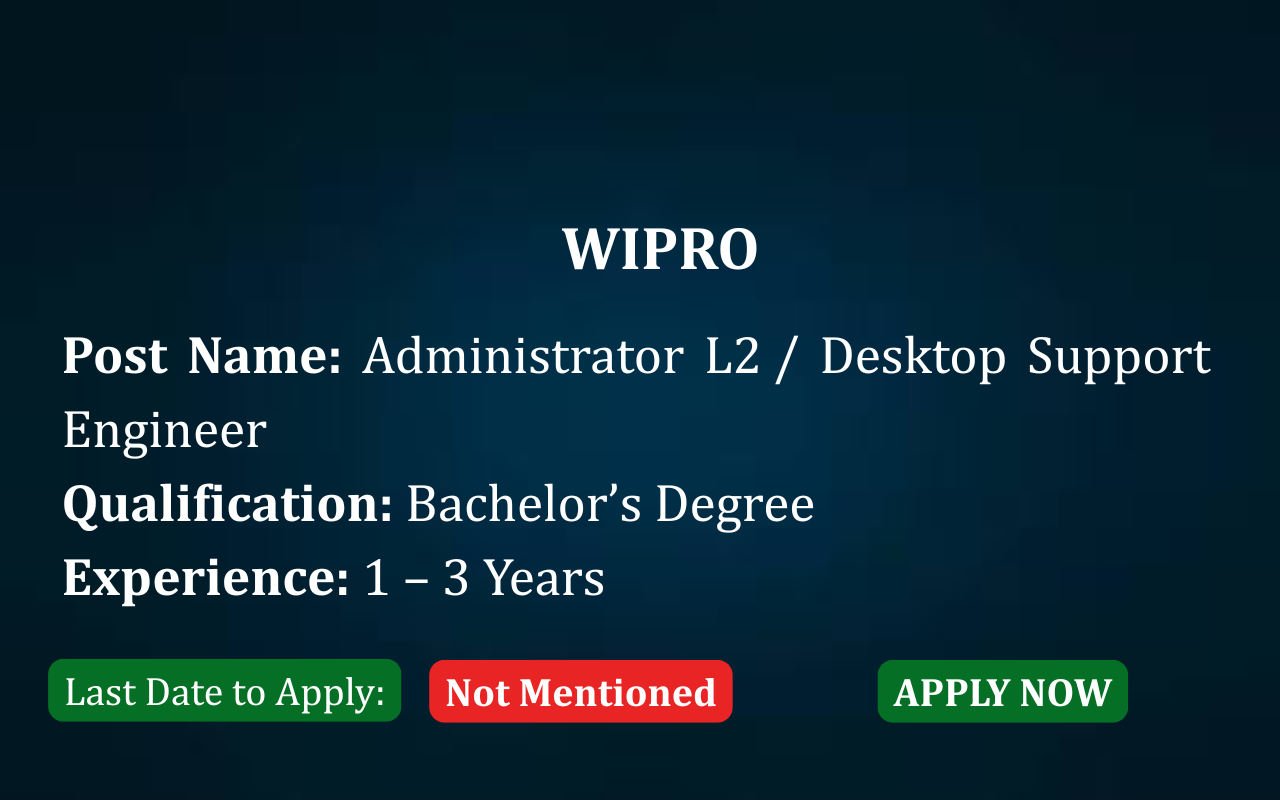 WIPRO ADMINISTRATOR L2 JOBS 2026 Wipro Limited is hiring Administrator L2 / Desktop Support Engineers to support enterprise IT environments by providing end-user technical assistance, system troubleshooting, and desktop operations support. About Wipro Wipro Limited (NYSE: WIT) is a global technology services and consulting company delivering digital transformation, consulting, engineering, and operations services. With over … Read more