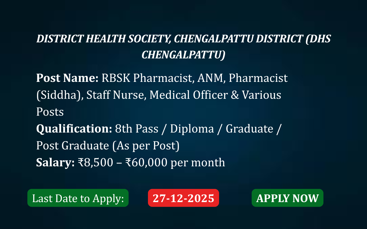 District Health Society, Chengalpattu District invites applications for multiple healthcare and administrative positions under various health programs. This recruitment drive is ideal for candidates with qualifications ranging from 8th pass to postgraduates, offering opportunities across medical, nursing, pharmacy, technical, and support services.