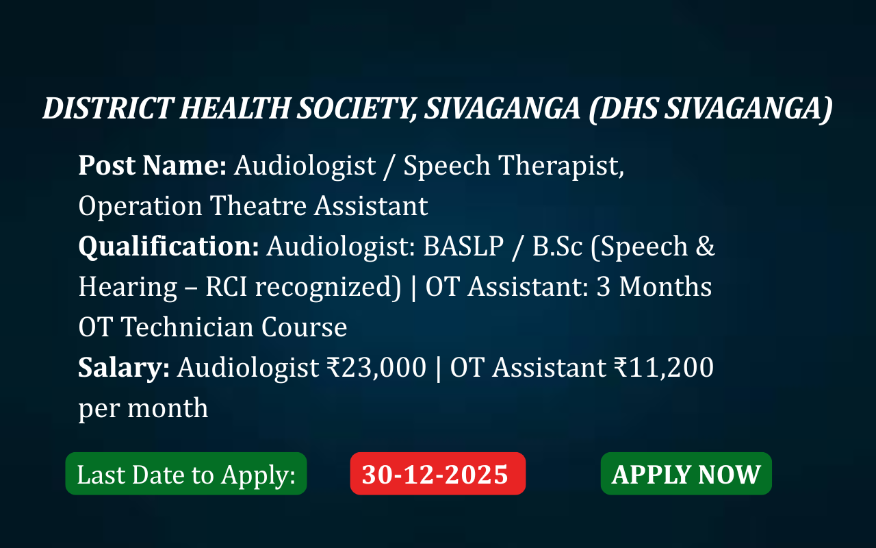 District Health Society, Sivaganga invites applications for healthcare positions including Audiologist / Speech Therapist and Operation Theatre Assistant. This recruitment is ideal for qualified healthcare professionals seeking stable government-sector roles in public health services.