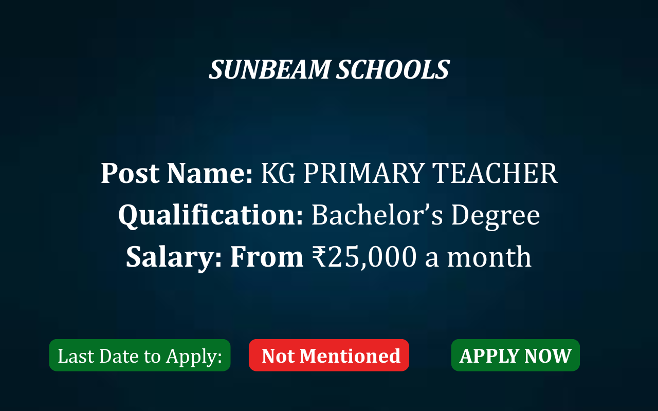 Sunbeam Schools is immediately hiring KG & Primary Teachers with excellent spoken English and exposure to Activity-Based Learning (ABL). This is a full-time teaching opportunity with attractive salary, accommodation, and facilities provided.
