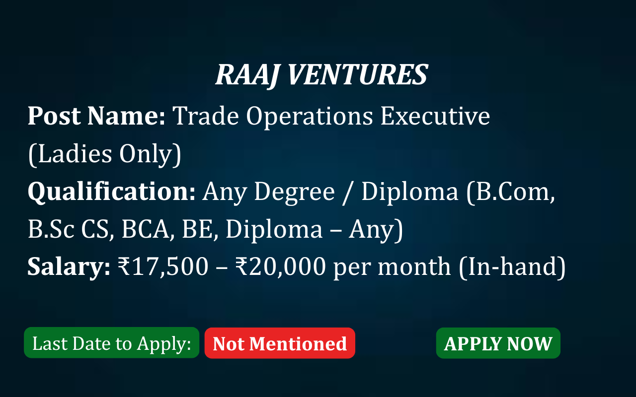 TRADE OPERATIONS EXECUTIVE JOB โ€“ COIMBATORE (LADIES ONLY) Raaj Ventures | Finance & Trade Operations Permanent | Full-Time | Fresher Friendly Job Overview Raaj Ventures is hiring Female candidates for the role of Trade Operations Executive at its Sai Baba Colony, Coimbatore office. This opportunity is ideal for freshers or candidates with less than 1 … Read more