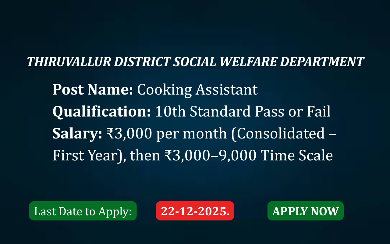 Thiruvallur District Social Welfare Department invites applications for the post of Cooking Assistant under the District Noon Meal Scheme. This recruitment is ideal for candidates seeking government-supported employment with basic educational qualifications and an opportunity to contribute to child nutrition and welfare services.